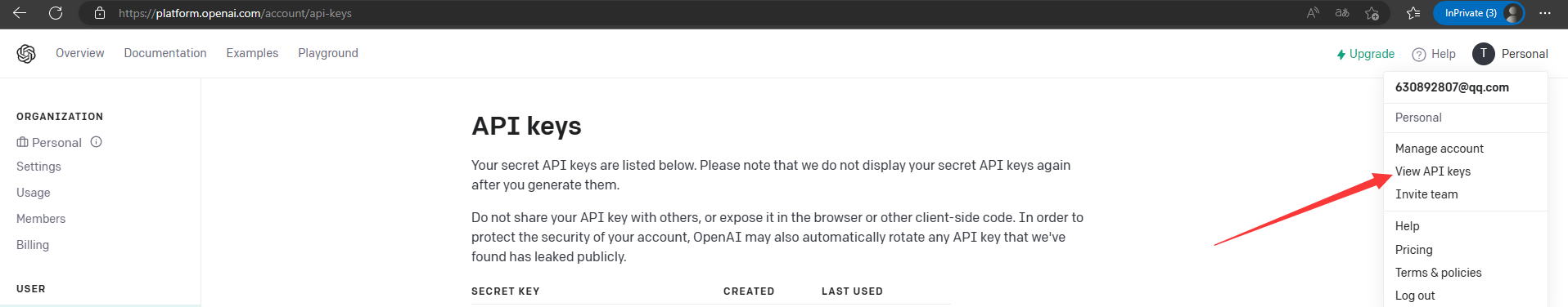 使用的前提是需要有chatGPT的账号去获取apikey,然后把拿到的apikey放在下面代码中