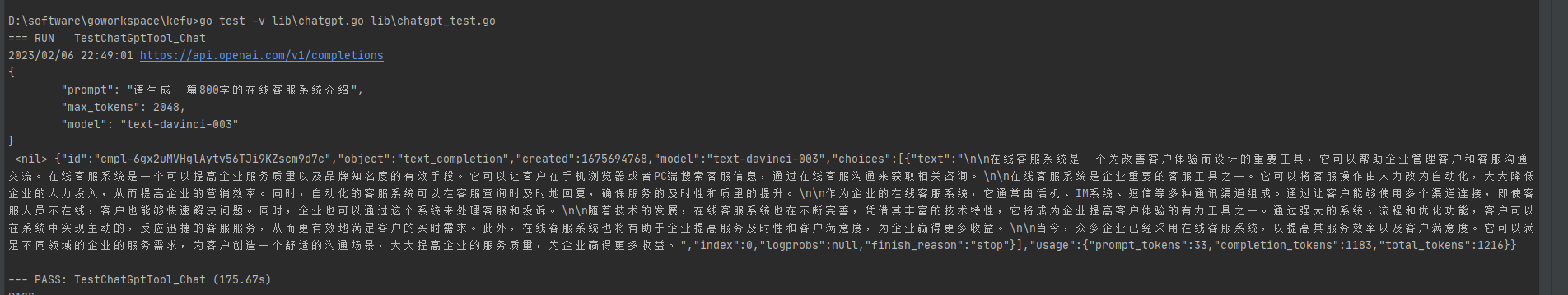 func TestChatGptTool_Chat(t *testing.T) { gpt := &ChatGptTool{ Secret: “密钥”, } gpt.Chat(“请生成一篇800字的在线客服系统介绍”)